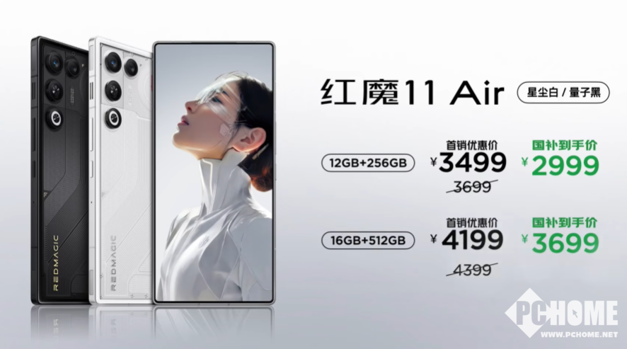 价格方面,红魔11 Air首发推出星尘白、量子黑配色,12+256GB售价3699元;16+512GB售价4399元;首销优惠200元,叠加国补2999元起!