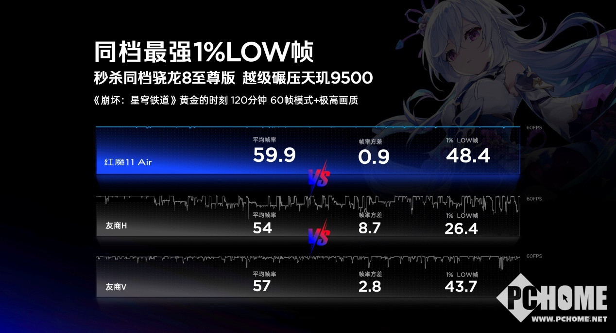 在60Hz极高画质下进行120分钟《崩坏:星穹铁道》黄金的时刻测试。红魔11 Air平均帧率为59.9帧,1%LOW帧为48.4帧;对比机型H平均帧率为54帧,1%LOW帧为26.4帧;对比机型V平均帧率为57帧,1%LOW帧为43.7帧。