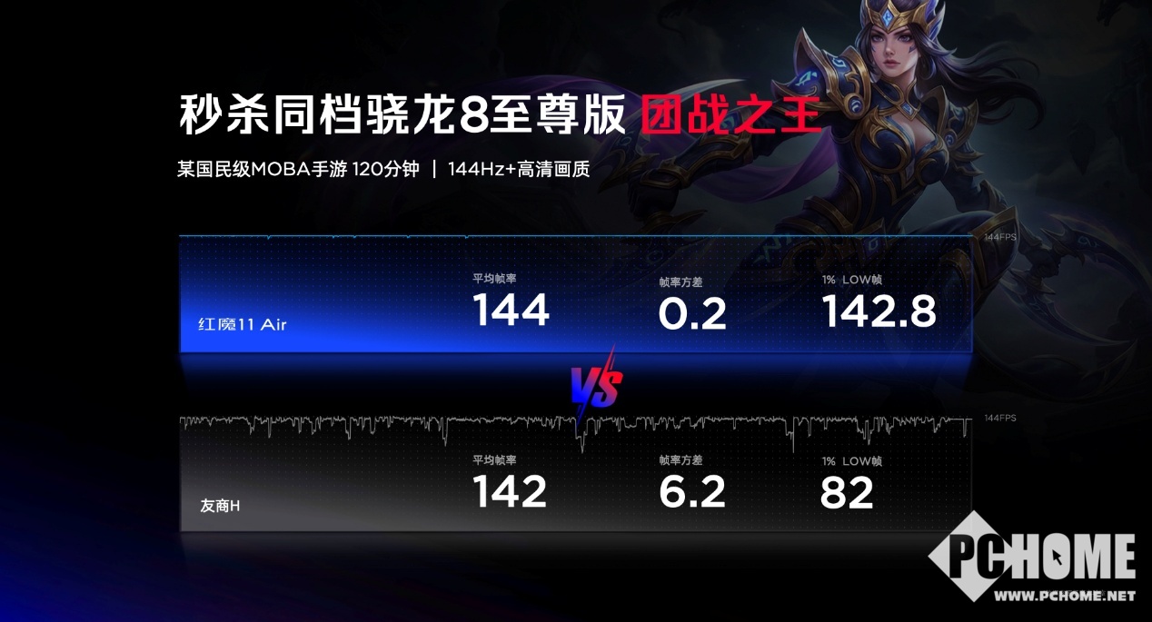 在144Hz高清画质下运行120分钟某国民级MOBA手游。红魔11 Air平均帧率为144帧,1%LOW帧为142.8帧,对比机型平均帧率为142帧,1%LOW帧为82帧。