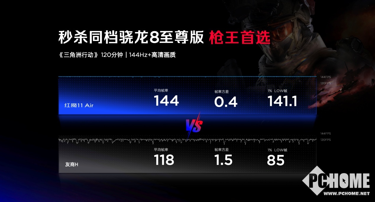 在发布会上,红魔官方也展示了红魔11 Air的游戏实测水平。在144Hz高清画质下运行120分钟《三角洲行动》,红魔11 Air平均帧率为144帧,1%LOW帧为141.1帧,对比机型平均帧率为118帧,1%LOW帧为85帧。