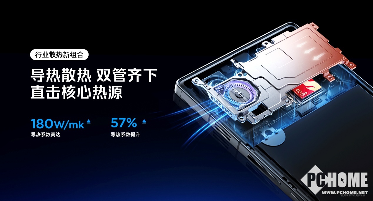 红魔11 Air这一次直接在Air机型上,首次搭载了主动散热风扇——驭风4.0,可实现每分钟24000转持续转速。同时红魔对扇叶架构做了调整,采用全新的高低扇叶差设计,风量风压提升21%,扫风面积增加40%,防尘率提升30%,静音效果提升50%,在高效散热的同时做到极低风噪。而为了把风扇带入更轻更薄的Air机型,红魔为其定制了航空铝风冷支架,航空铝材质不仅具备高导热性能,而且质量更轻、强度更高。同时散热模组的全新组合,也让导热与散热双效协同,导热系数高达180W/mk,导热系数提升了57%。