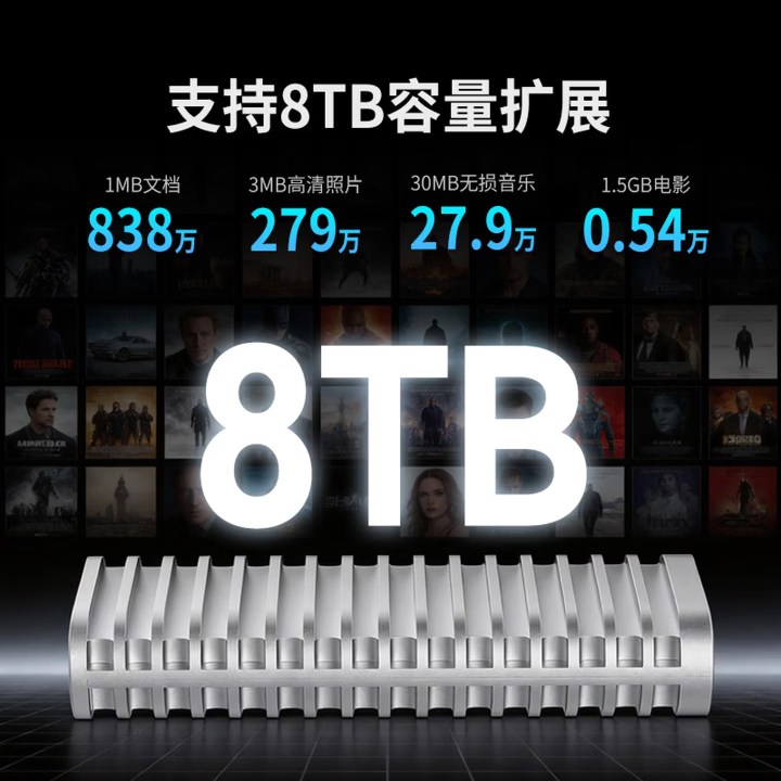 传输与兼容性表现亮眼,支持USB 3.2 Gen2协议,理论带宽达10Gbps,实测连续读取速度1020MB/s、写入速度1010MB/s,1GB文件传输仅需约1秒。该硬盘盒兼容PCIe 3.0/4.0/5.0协议的M.2 NVMe SSD,自动适配2280规格硬盘,单盘最大支持8TB容量,满足大容量存储需求。