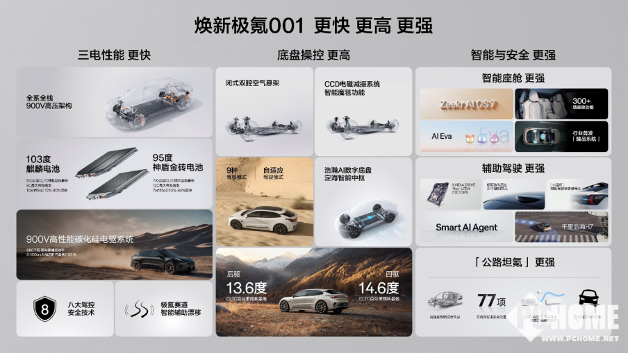 在核心技术方面,焕新001全系标配900V高压架构,支持最高1.32兆瓦充电功率,搭载95度神盾金砖电池可实现“7分钟快充”,成为全球充电最快的量产纯电车。性能上,四驱版峰值功率达680千瓦,零百加速仅需2.83秒,最高时速提升至280km/h。操控系统首次引入CCD电磁减振与闭式双腔空气悬架,结合行业首创的浩瀚AI数字底盘,实现9种驾驶模式的智能切换,并首发智能辅助漂移系统,显著提升驾驶乐趣与安全表现。