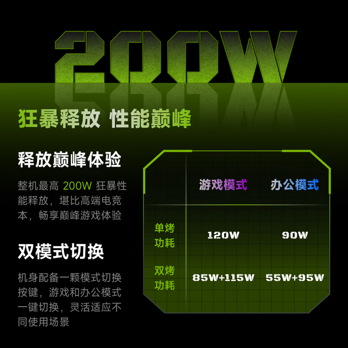 扩展与接口兼顾专业与灵活,支持双通道DDR5内存(最高扩展至96GB),配备双M.2 PCIe 4.0/5.0 SSD插槽,最高支持8TB存储且附赠SSD散热片;接口涵盖USB4、HDMI 2.1、2.5GbE网口、SD读卡器,支持Wi-Fi 7与蓝牙5.4,满足多屏协同与高速数据传输需求。该机支持一键切换双模式,游戏模式解锁200W整机功耗;办公模式将功耗限制为150W,兼顾能效与静音。