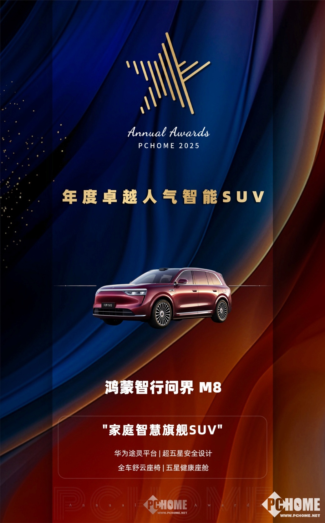 PChome 2025年度卓越产品评选中,鸿蒙智行问界 M8凭借出色的综合表现,荣获“年度卓越人气智能SUV”奖项。