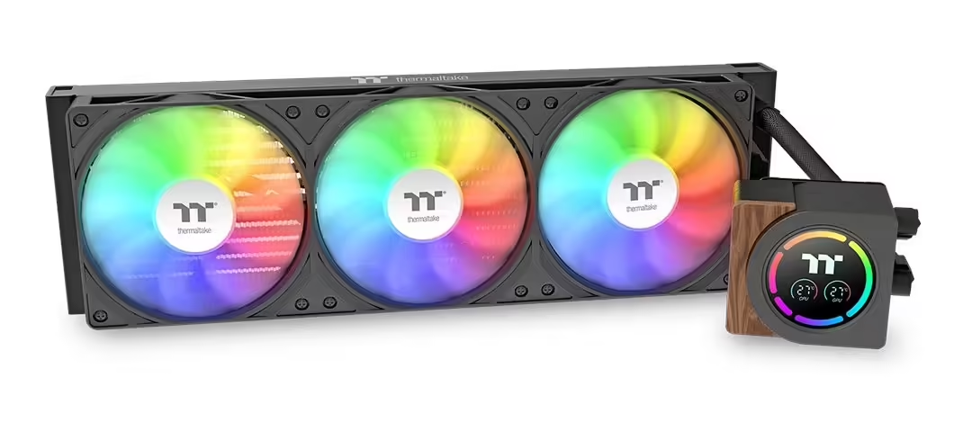 独特外观主打自然美学设计,首次融入木纹装饰+数显屏,在冷头侧面采用木纹材质装饰,中部嵌入段码式LCD屏幕,可同时显示CPU和GPU温度,兼顾简约风格与功能性。在配色方面也延续曜越经典双配色(纯白/黑色可选)方案,适配不同装机主题。