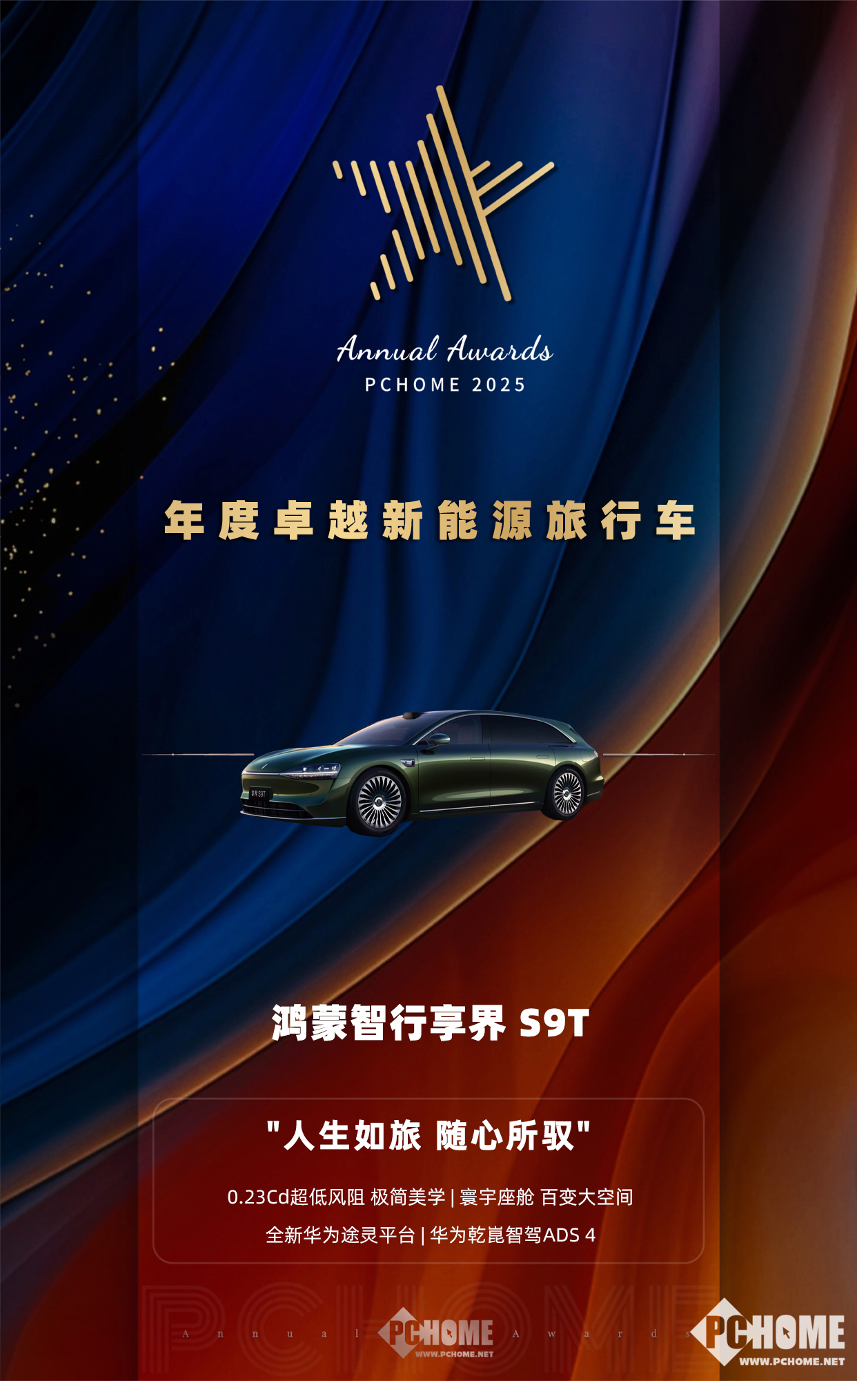 PChome 2025年度卓越产品评选中,鸿蒙智行享界 S9T以其清晰的产品定位与突出的综合实用价值,荣获“年度卓越新能源旅行车”奖项。