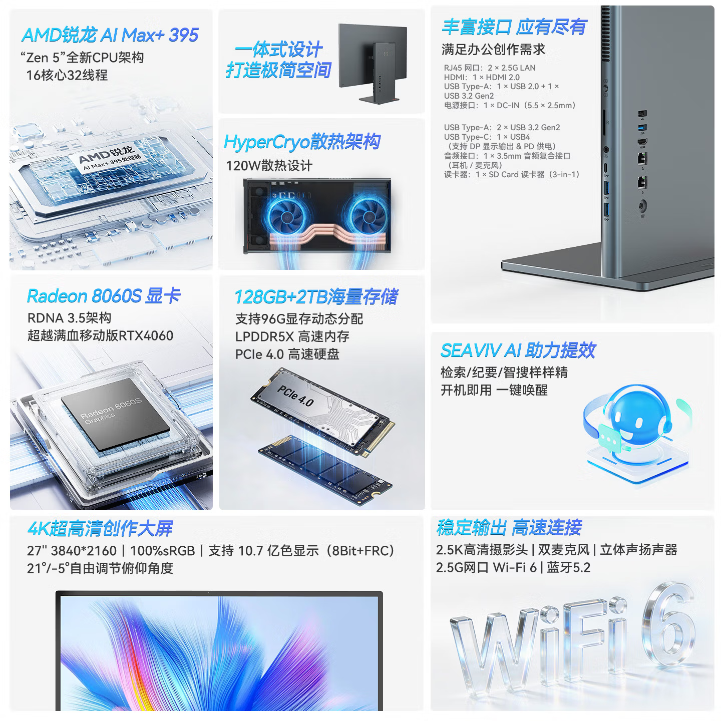 SEAVIV希未最新发布的AideaONE R27一体机是业内首款搭载AMD锐龙AI Max+395处理器的AI高性能一体机,主打专业创作与高效办公场景。