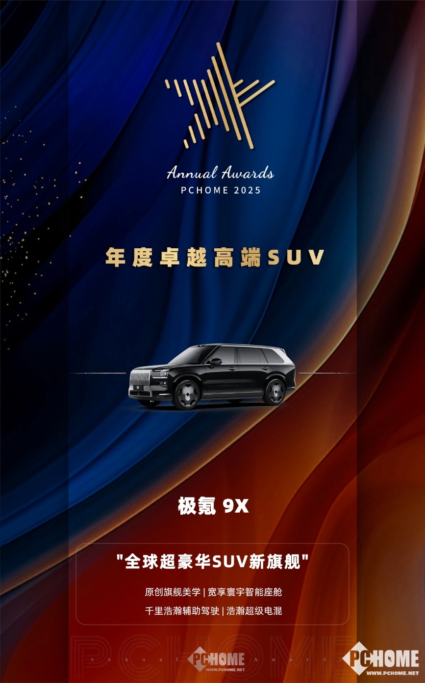 PChome 2025年度卓越产品评选中,极氪 9X凭借其在高端定位、整体品质以及系统化体验方面的突出表现,荣获“年度卓越高端SUV”奖项。