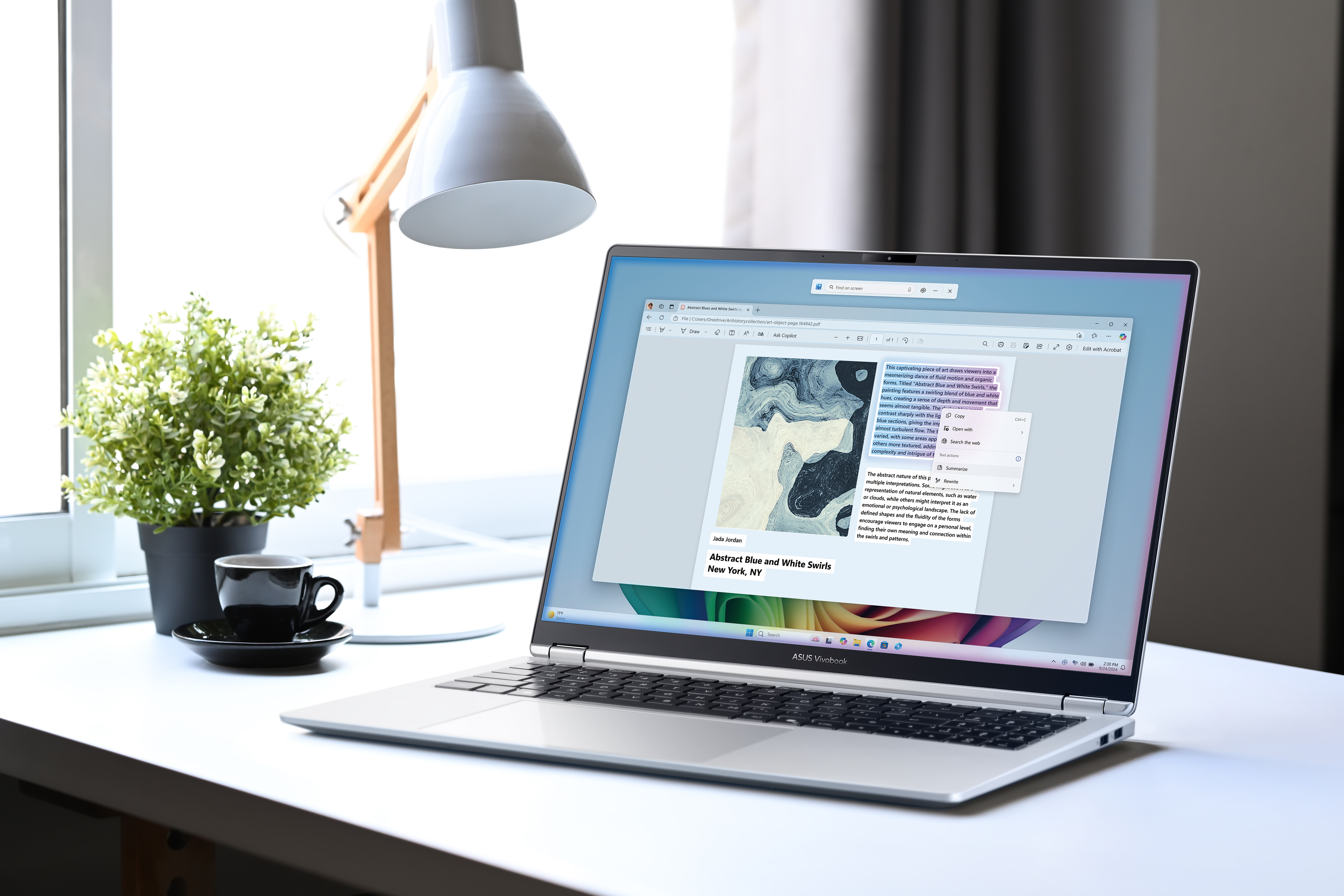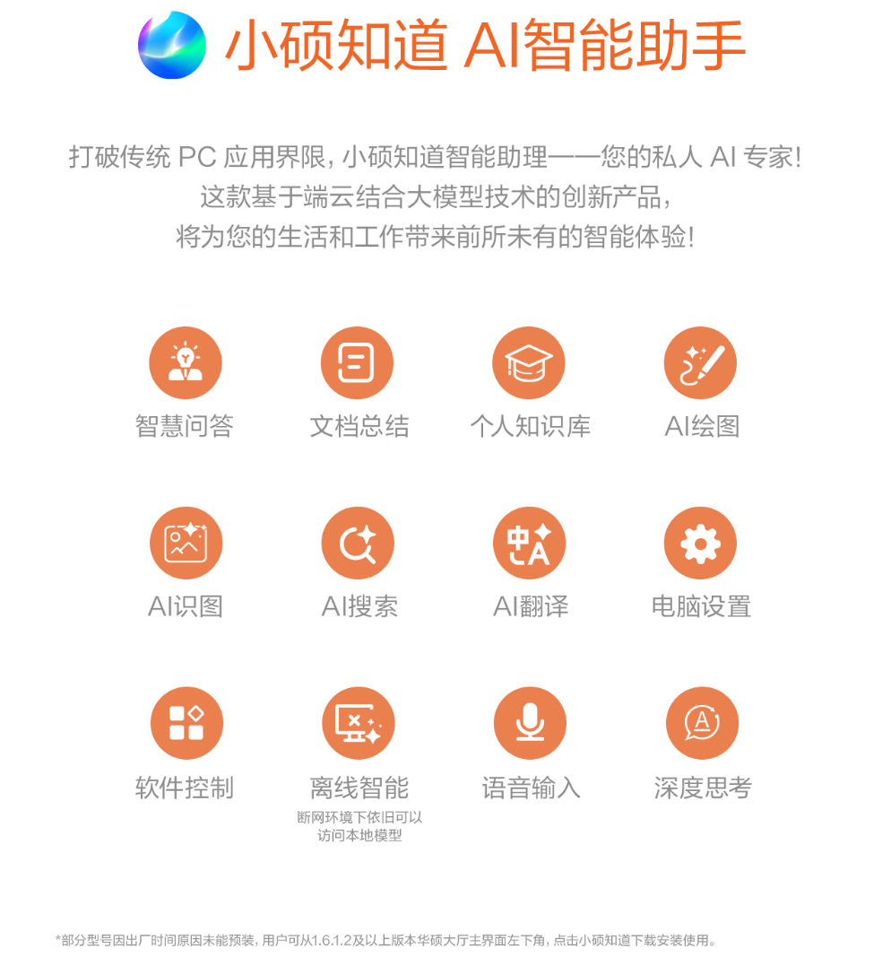 而这两款机型所搭载的AI功能,更是此次升级的重头戏、核心亮点。内部均搭载华硕“小硕知道”AI智能助手,基于端云结合大模型技术,支持智慧问答、文档总结、个人知识库、AI绘图、多语言翻译等多项功能。你可以导入PDF、Word、PPT等多种格式的文件,让AI快速提炼文档核心内容;也能通过AI绘图功能,输入关键词生成创意图片;甚至可以用语音指令控制电脑,解放双手提高效率。