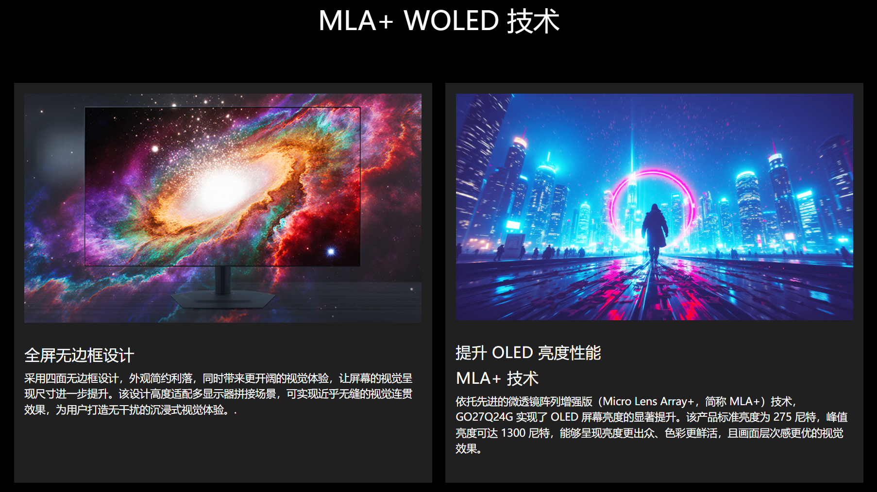 而对于一款显示器来讲,其核心竞争力、性能基石在于其面板的综合表现,所以技嘉GO27Q24G在面板方面下足了功夫。搭载全新WOLED面板,配合多项独家技术,实现了画质与流畅度的双重突破。屏幕采用27英寸2K QHD(2560×1440)的黄金分辨率,兼顾了画面大小与画质分辨率,既不会像24英寸屏幕那样视野过小,也不会像4K屏幕那样对显卡性能要求过高;同时2K分辨率、240Hz刷新率的配置不仅可以让玩家兼顾FPS游戏的帧数,还能满足一部分3A大作的游玩需求。