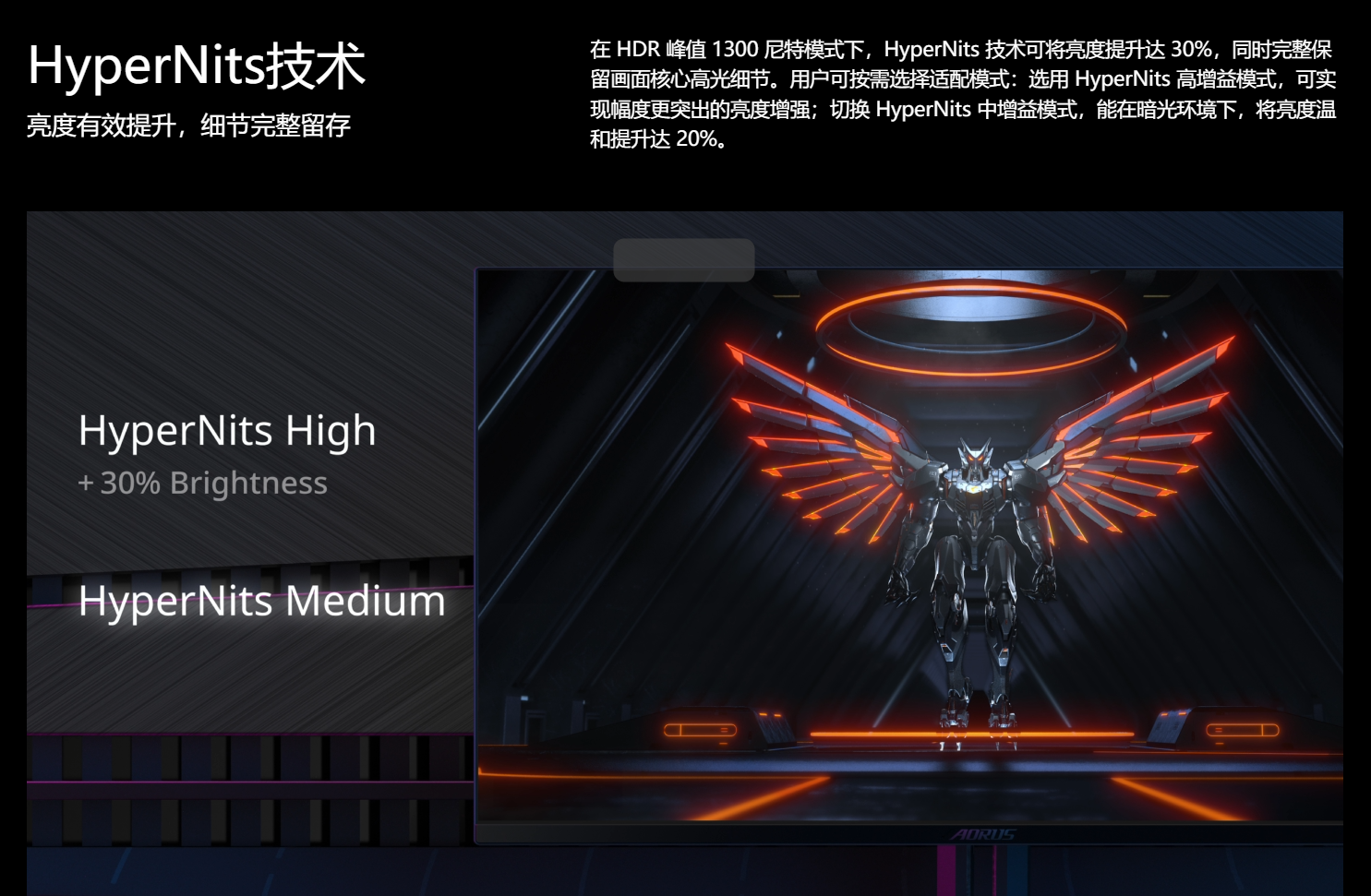 亮度够了,但是在提升画面细节方面,技嘉也为此专门搭载了两大独家技术:HyperNits技术,可将亮度提升达30%,同时完整保留画面核心高光细节。用户可按需求选择适配模式:选用HyperNits高增益模式,可实现幅度更突出的30%亮度增强;切换HyperNits中增益模式,能在暗光环境下,将亮度温和提升达20%。