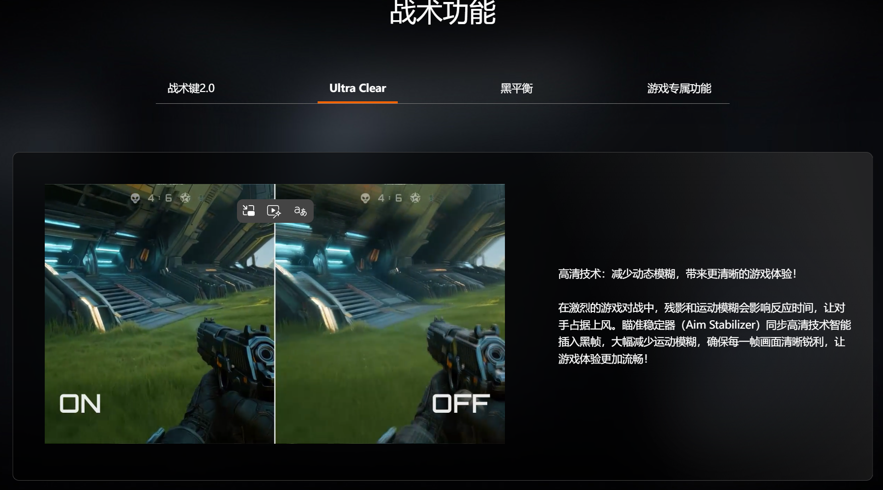 同时,Ultra Clear动态清晰功能则针对高速运动的游戏场景优化,通过高清技术智能插入黑帧的方式,有效清除画面中的运动模糊,确保每一帧画面都足够清晰;黑平衡功能则解决了游戏中暗部细节丢失的问题,可智能提升暗部区域的亮度与细节,让躲在阴影里的细节无处藏身,同时又不过度曝光亮部区域,保持画面的整体层次感。