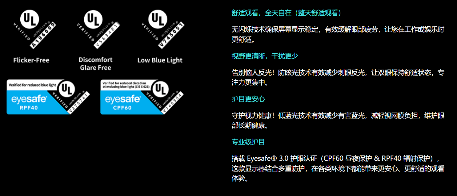 屏幕通过莱茵TÜV低蓝光权威认证,精准去除对眼睛有害的蓝光频段,在保证画面色彩自然的同时,减少蓝光对视网膜的刺激;搭载Eyesafe 3.0护眼认证,让这款显示器结合多重防护,在各类环境下都能带来更安心、更舒适的观看体验。搭载技嘉OLED可变刷新率防闪烁技术,通过优化可变刷新率的范围,避免因刷新率波动导致的屏幕闪烁,从根源上减少视觉疲劳。