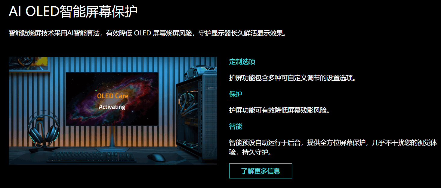 OLED面板虽拥有极致的画质表现,但OLED面板烧屏问题始终是用户选购的首要顾虑。面对这一问题,技嘉选择从技术和售后两方面一起入手,彻底打消用户的后顾之忧。这款显示器搭载AI OLED智能保护技术,通过AI算法实时监测面板的显示状态,针对不同场景的画质需求,从而做出不同的调整,避免长期高负荷工作导致的老化问题,从技术层面延长面板的使用寿命。