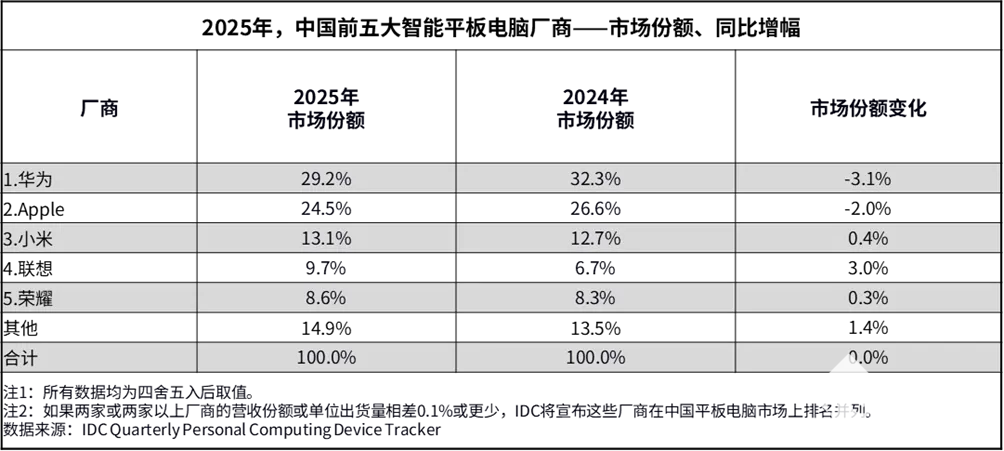 苹果2025年市场份额位列第二,全年出货量迎来同比增长。第四季度,iPad Pro 系列完成迭代上新,进一步巩固其在高端市场的竞争力;同时,iPad Air 系列在“双十一”大促中表现突出,共同推动苹果当季市场份额环比回升。