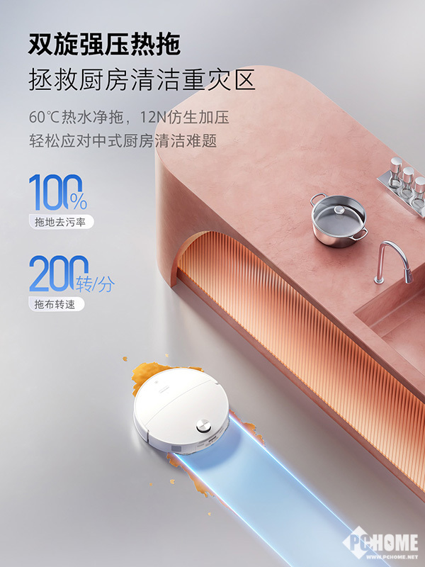 拖地方面,P20 Max支持最高12N动态下压力与60℃恒湿热擦,在重污区域自动增强清洁强度;常态8N压力兼顾地面保护。双旋拖布最高200转/分钟,结合动态机械臂贴边设计,实现更高边角覆盖率。通过吸力、结构设计与路径策略的协同,构建完整的清洁能力闭环。