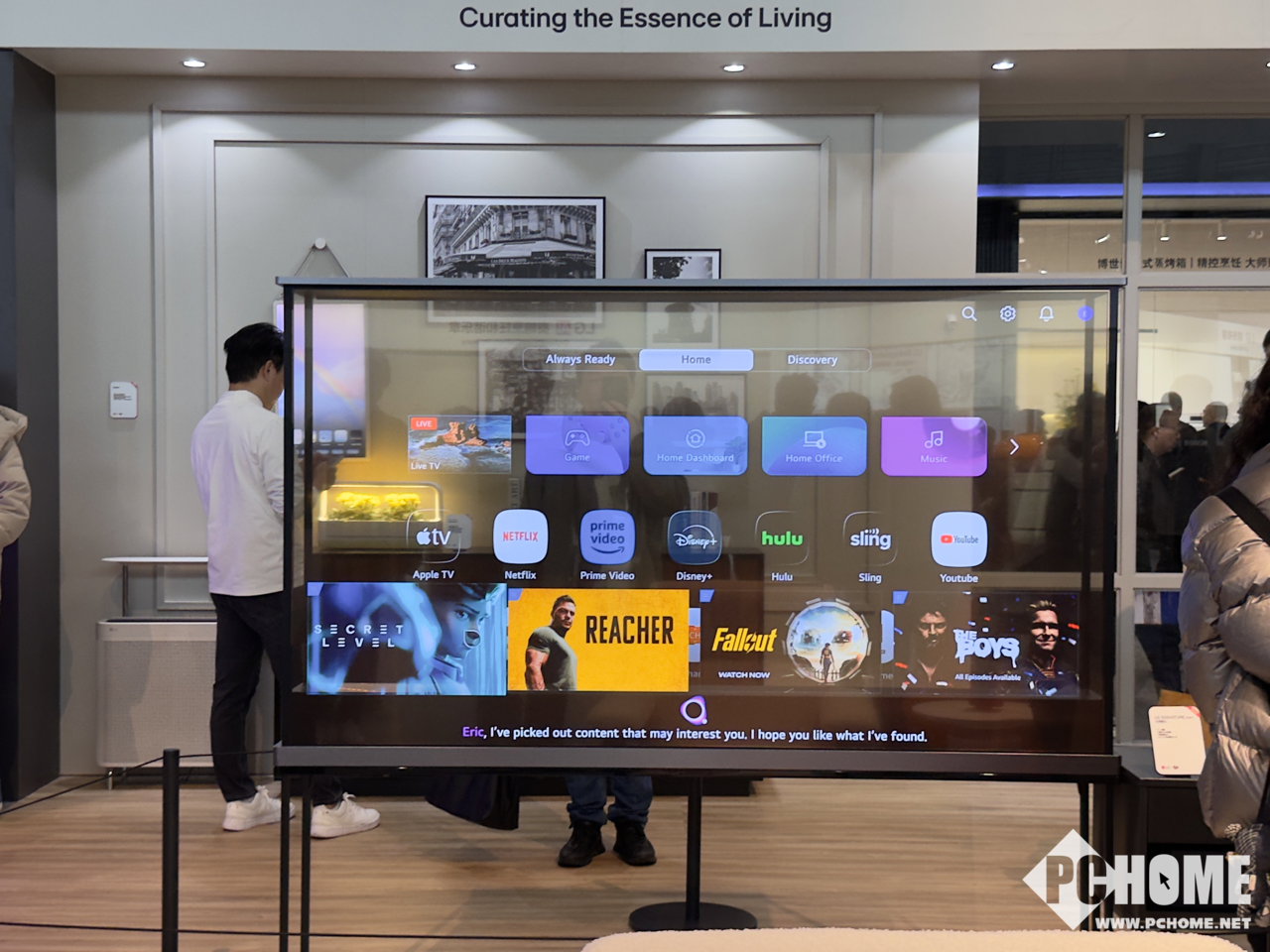 在现场非常吸引视线的还有全球首款透明OLED电视——LG SIGNATURE OLED T,是全球首款最大、高分辨率的透明OLED电视。电视搭载透明OLED技术、α11 AI音/画芯片4K以及无线AV传输技术。