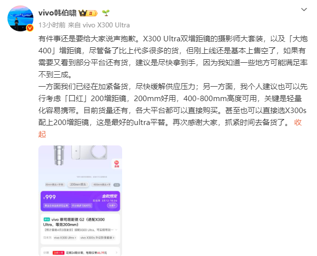 vivo产品经理韩伯啸透露,vivo X300 Ultra双增距镜的摄影师大套装,以及「大炮400」增距镜,尽管进行了更多备货,但已基本上售空了,目前vivo方面已经在加紧备货。