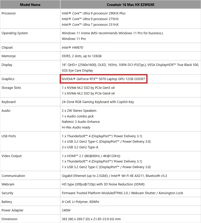 性能层面,搭载英特尔酷睿Ultra 200HX Plus处理器,最高可选RTX 5070独立显卡。不过目前显卡显存规格存在信息分歧,官方标注为8GB GDDR7,另有部分资讯提及12GB版本,选购需以官方参数为准。