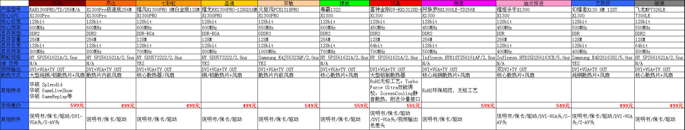 这一次,我们并不以分数论英雄,也不以规格说优劣。每一款产品均有其市场定位,无论你说64bit显存“阉割”了性能也好,小板看着不够YY也好,256M大容量没什么意义也好……这些其实并不重要。只要他们都根据自己的产品进行明确的市场定价,而获得正确的市场定位,必然有相应的消费者需求。中高端市场相差了2、300元似乎没什么区别,而低端市场2、30块钱就决定了用户的购买意向,也为不同产品分了等级。是的,一眼望去都是5、600块钱的X1300,却依然是“等级森严”。据个例子,同样的X1300吧,有的只要499,而有的就要555。有的消费者就认为“都是X1300,当然买便宜的”;有的消费者就觉得“贵的肯定品牌好,东西好”。而测评就能提供一个比较客观而直观的方式,让持币观望的网友了解更多相关信息。