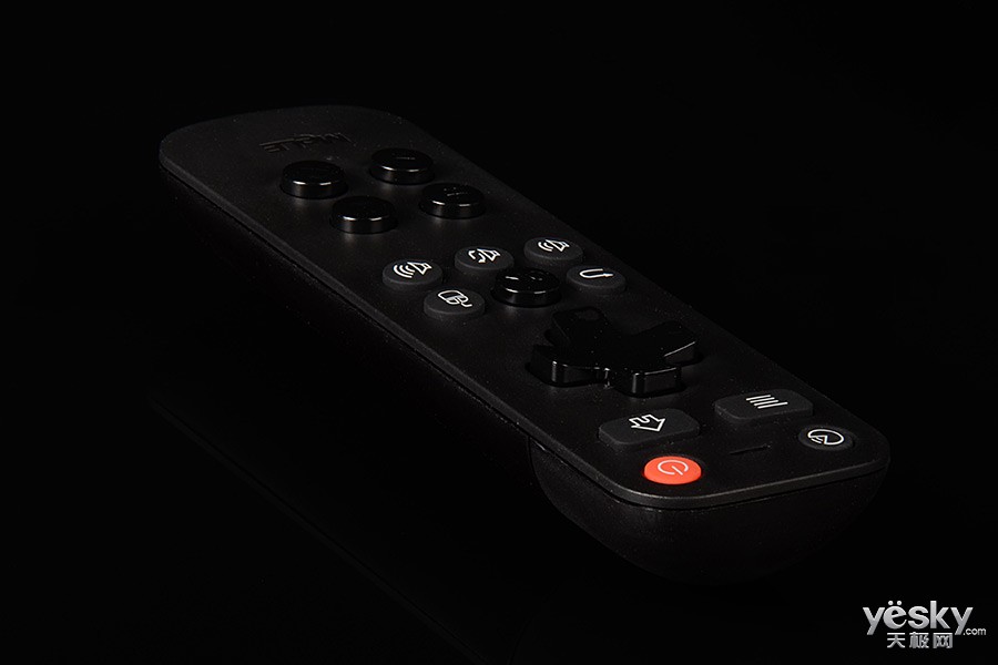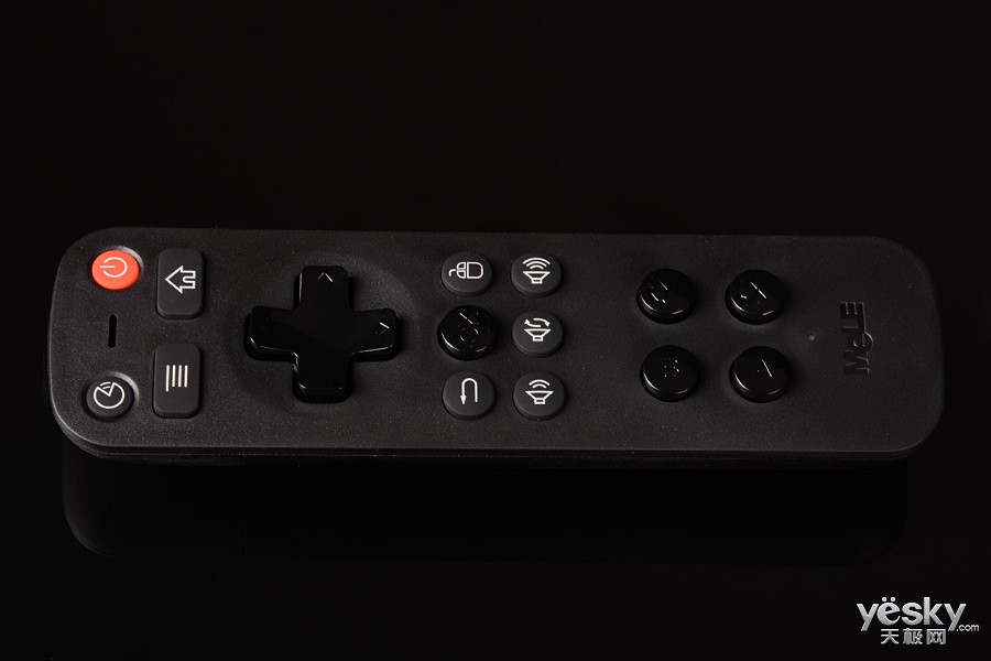 迈乐M8标配的是R1红外遥控器,遥控器的外形设计倒是更接近于游戏手柄,特别是方向键与几个操作键的特殊高光表面。如果想要玩体感游戏还得另外掏钱买R5手柄或是小葱网络的周边配件。