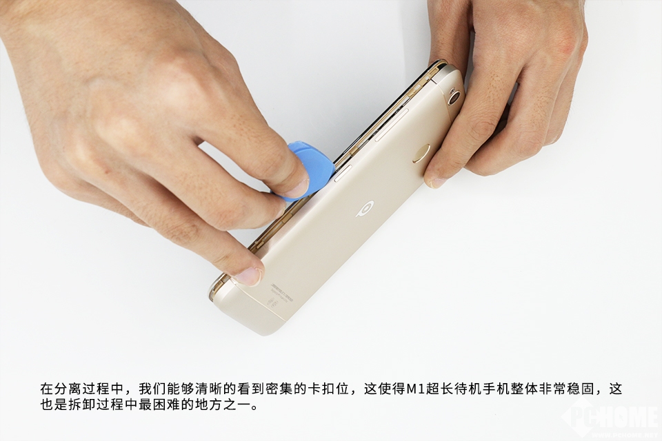 在分离过程中,我们能够清晰的看到密集的卡扣位,这使得M1超长待机手机整体非常稳固,这也是拆卸过程中最困难的地方之一。