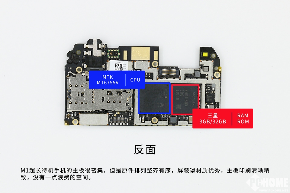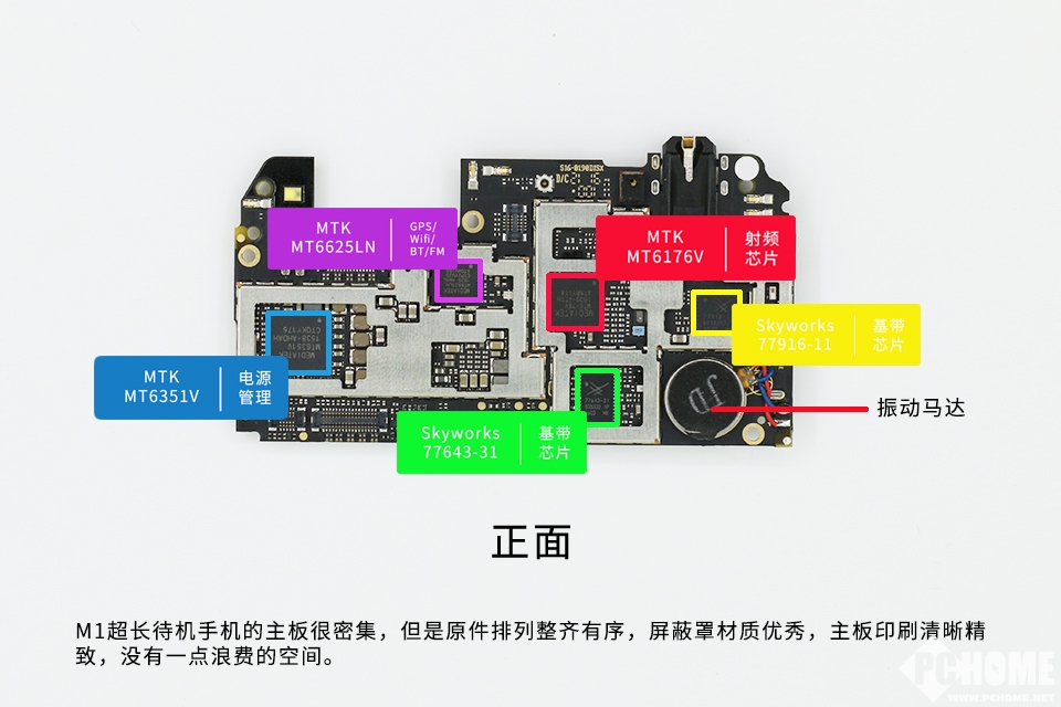 M1超长待机手机的主板很密集,但是原件排列整齐有序,屏蔽罩材质优秀,主板印刷清晰精致,没有一点浪费的空间。
