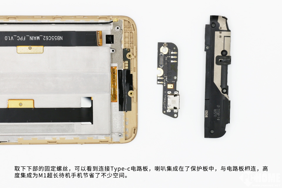 取下下部的固定螺丝,可以看到连接Type-c电路板,喇叭集成在了保护板中,与电路板相连,高度集成为M1超长待机手机节省了不少空间。