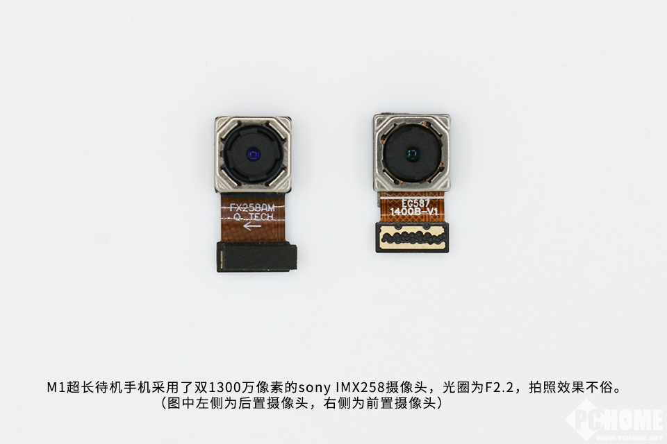 M1超长待机手机采用了双1300万像素的sony IMX258摄像头,光圈为F2.2,拍照效果不俗。(图中左侧为后置摄像头,右侧为前置摄像头)