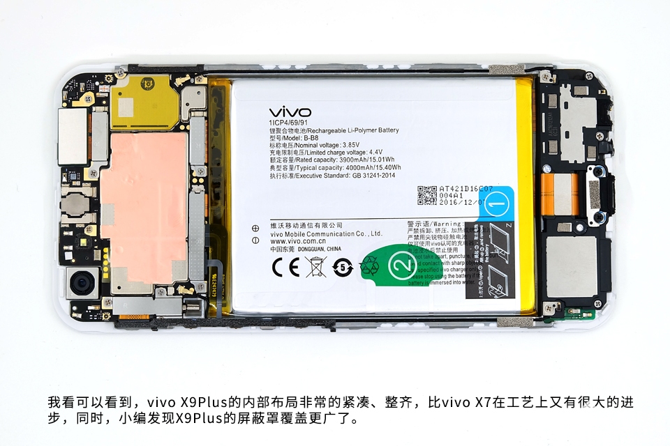 我看可以看到,vivo X9Plus的内部布局非常的紧凑、整齐,比vivo X7在工艺上又有很大的进 步,同时,小编发现X9Plus的屏蔽罩覆盖更广了。