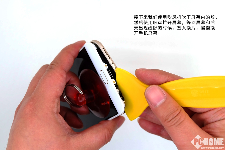 接下来我们使用吹风机吹干屏幕内的胶, 然后使用吸盘拉开屏幕,等到屏幕和后壳出现缝隙的时候,塞入撬片,慢慢撬 开手机屏幕。