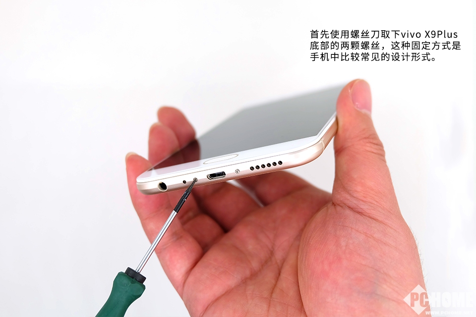首先使用螺丝刀取下vivo X9Plus底部的两颗螺丝,这种固定方式是手机中比较常见的设计形式。