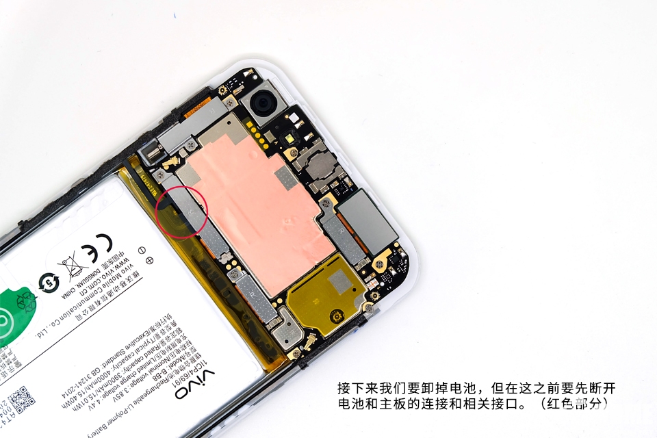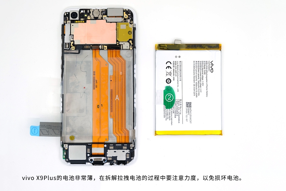vivo X9Plus的电池非常薄,在拆解拉拽电池的过程中要注意力度,以免损坏电池。