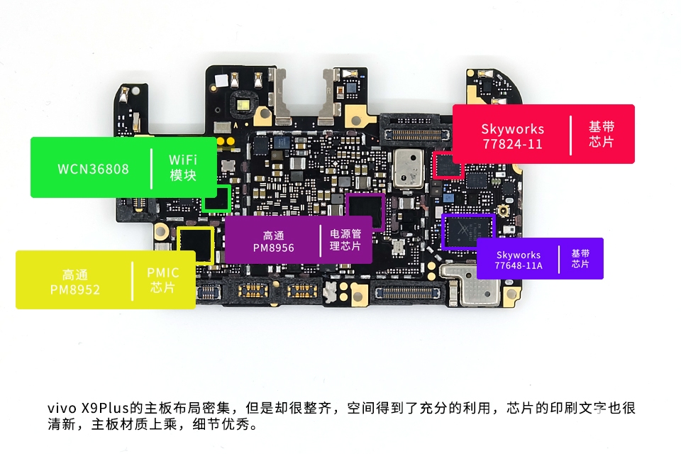 vivo X9Plus的主板布局密集,但是却很整齐,空间得到了充分的利用,芯片的印刷文字也很清新,主板材质上乘,细节优秀。