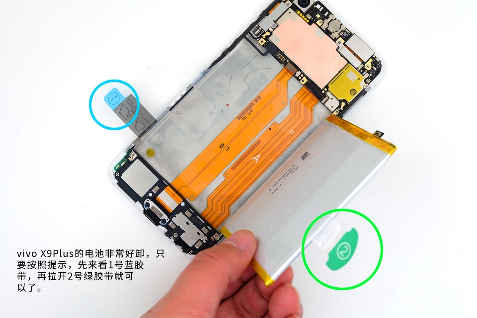 vivo X9Plus的电池非常好卸,只要按照提示,先来看1号蓝胶带,再拉开2号绿胶带就可以了。