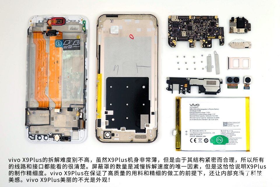 vivo X9Plus的拆解难度别不高,虽然X9Plus机身非常薄,但是由于其结构紧密而合理,所以所有的线路和接口都能看的很清楚。屏蔽罩的数量是减慢拆解速度的唯一因素,但是这恰恰说明X9Plus的制作精细度。vivo X9Plus在保证了高质量的用料和精细的做工的前提下,还让内部充满了科技美感。vivo X9Plus美丽的不光是外观!