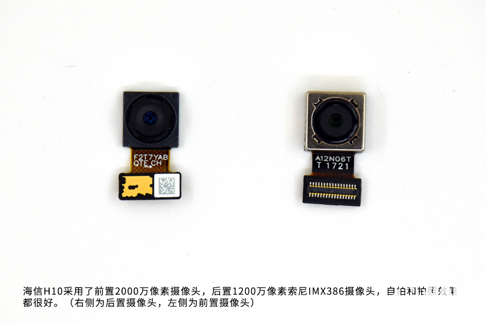 海信H10采用了前置2000万像素摄像头,后置1200万像素索尼IMX386摄像头,自拍和拍照效果都很好。(右侧为后置摄像头,左侧为前置摄像头)