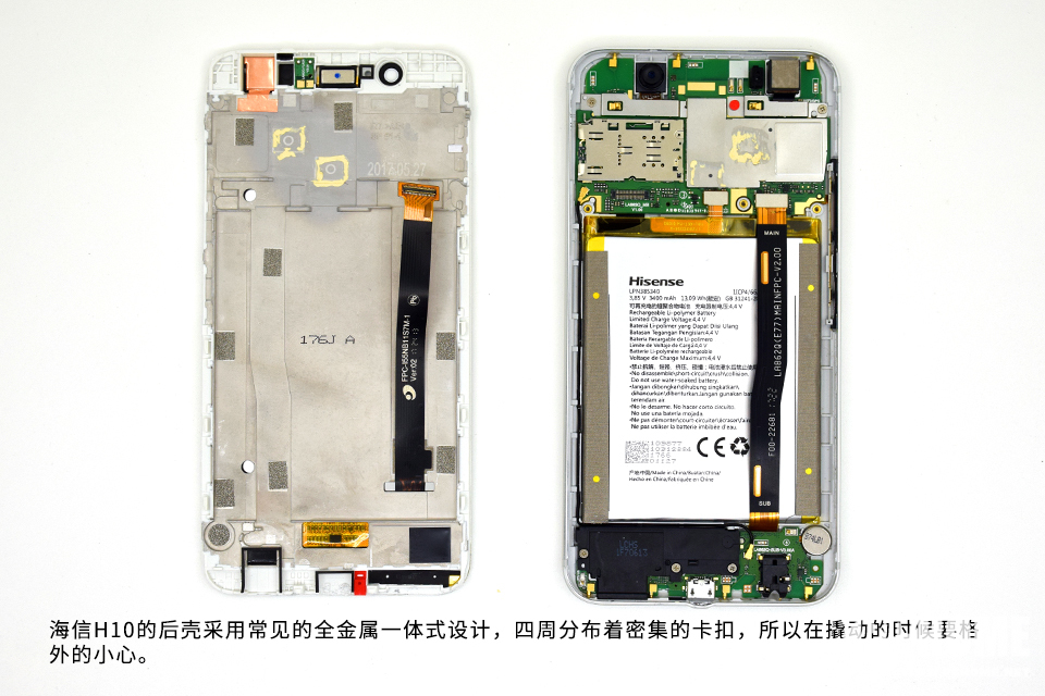 海信H10的后壳采用常见的全金属一体式设计,四周分布着密集的卡扣,所以在撬动的时候要格外的小心。