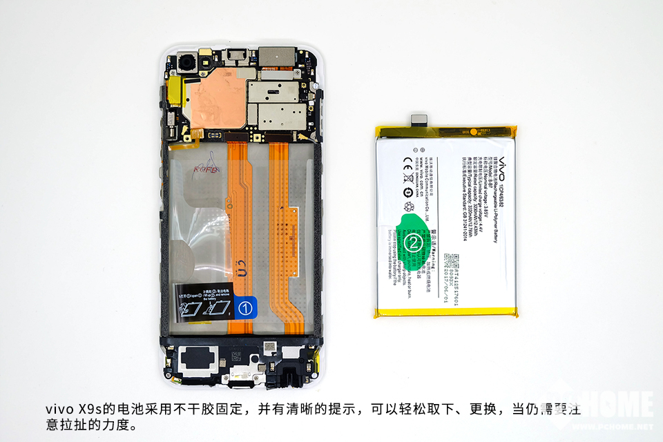 vivo X9s的电池采用不干胶固定,并有清晰的提示,可以轻松取下、更换,当仍需要注意拉扯的力度。