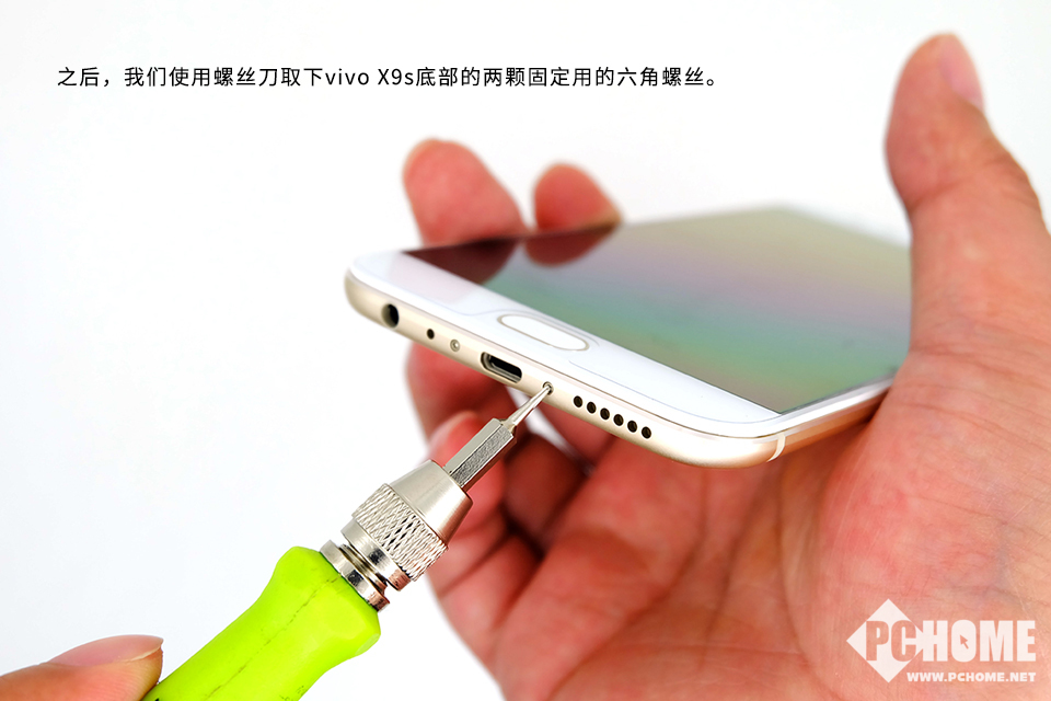 之后,我们使用螺丝刀取下vivo X9s底部的两颗固定用的六角螺丝。