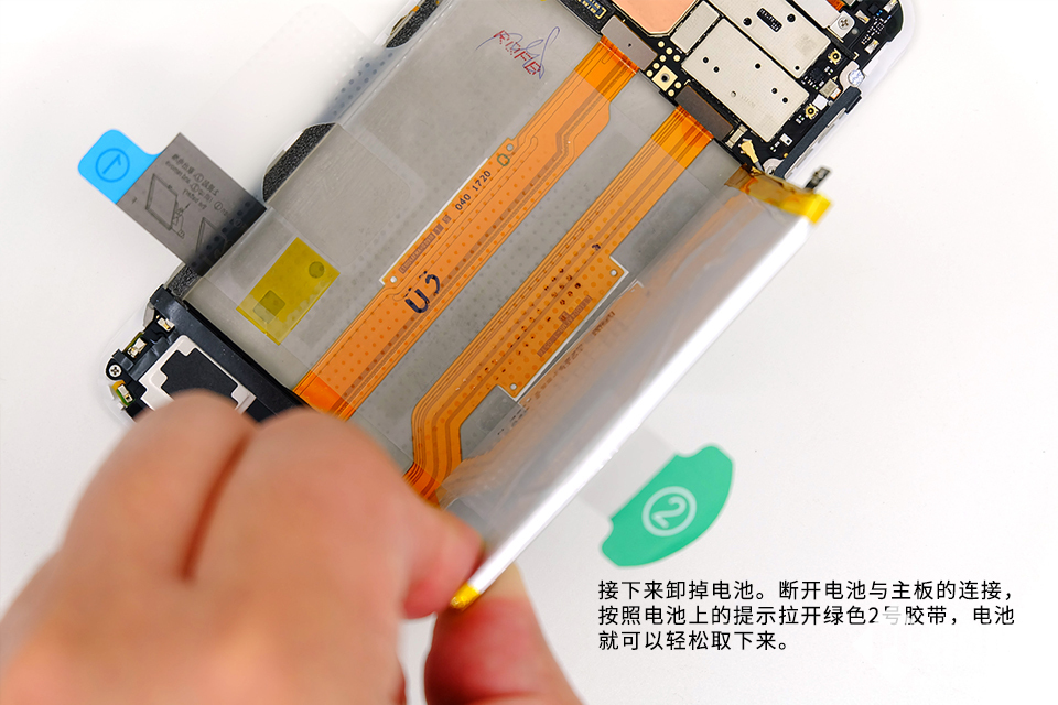 接下来卸掉电池。断开电池与主板的连接,按照电池上的提示拉开绿色2号胶带,电池就可以轻松取下来。