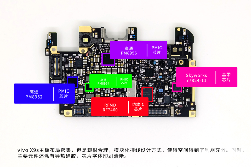 vivo X9s主板布局密集,但是却很合理,模块化排线设计方式,使得空间得到了利用充分。同时,主要元件还涂有导热硅胶,芯片字体印刷清晰。