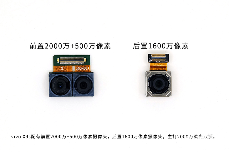 vivo X9s配有前置2000万+500万像素摄像头,后置1600万像素摄像头,主打2000万柔光双摄。