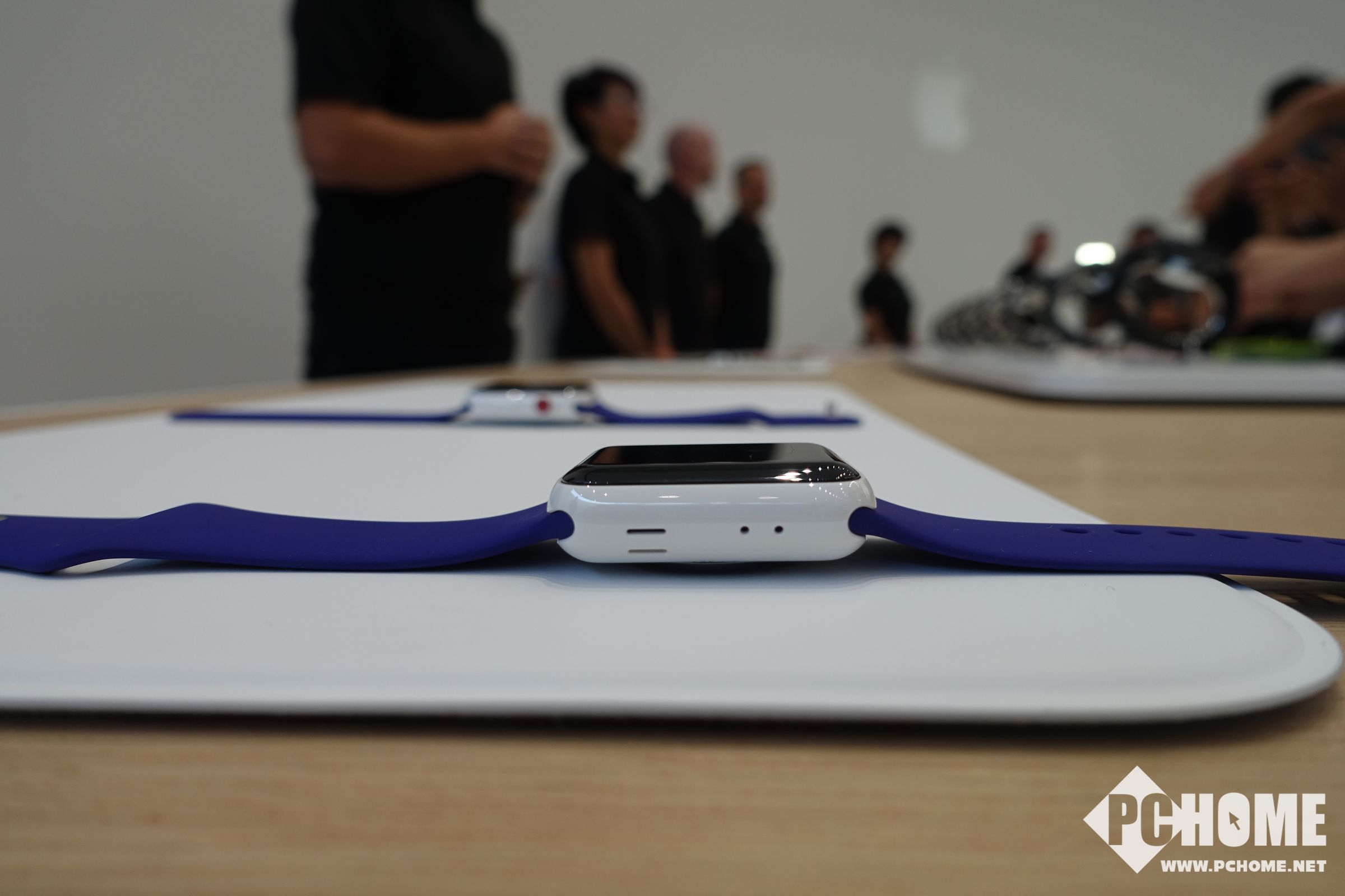【PChome智能硬件频道美图】本次发布的全新Apple Watch被命名为Apple Watch Series 3,分为GPS和蜂窝数据两个版本,蜂窝数据版本能够完全脱离手机接打电话和上网,成为了一台完全独立的无线通讯设备。此外,它还配备了更好的心率监测模块,支持全天的心率监测,在内容方面拥有4000万首的海量曲库可供播放。