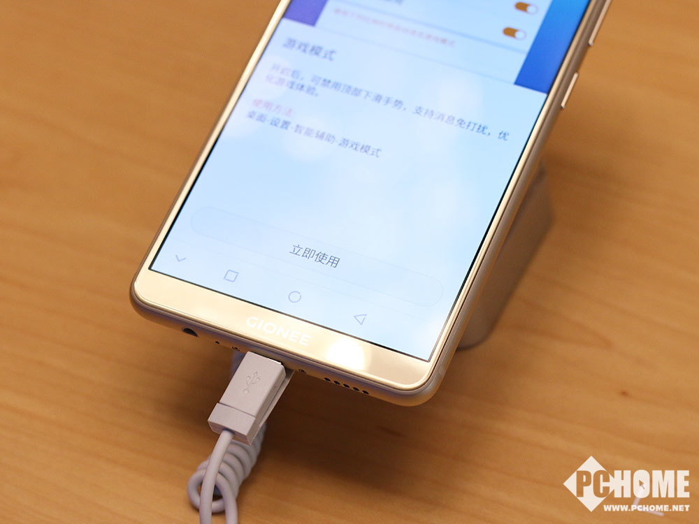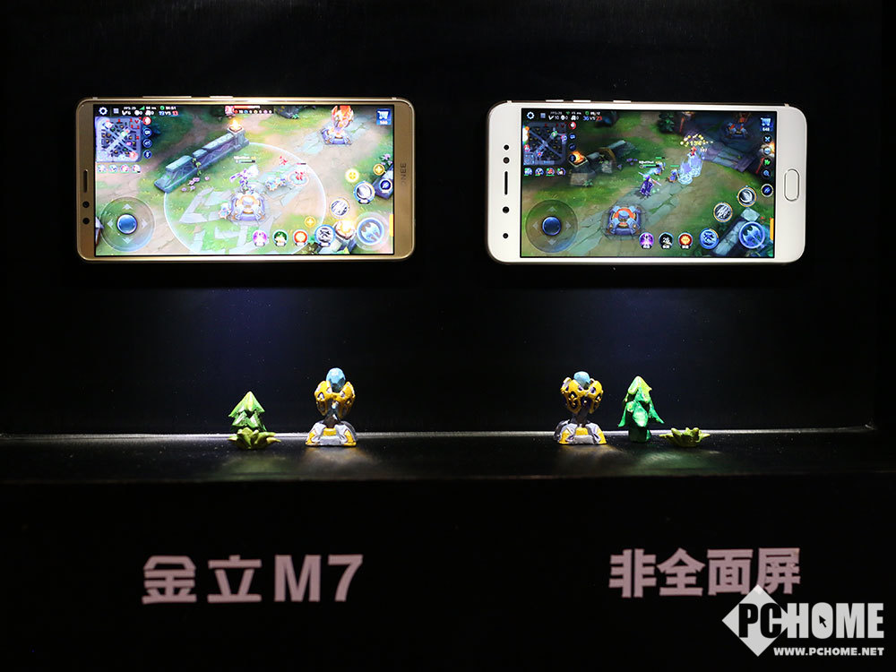 金立M7配备一块6.01英寸的AMOLED屏幕,其采用全面屏设计,18:9的屏幕比例,分辨率2160x1080,DCI-P3色域100%覆盖,支持HDR动态调节,显示效果鲜艳并具有护眼模式。当然这块屏幕的最大特色还是全面屏设计了,它让这块巨屏的金立M7,只有相当于传统5.5英寸屏幕手机的机身尺寸,同时显示面积增加了12.5%,无论是看视频还是玩游戏,均有着极为爽快的视觉效果,在MOBA游戏中,更是有着更广阔的视角,堪称合法外挂。
