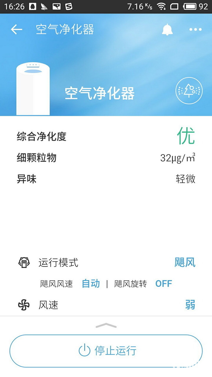 APP UI界面设计走的是简洁时尚的路线,空气净化指数、参数标注以及开关按键都标注足够显眼的位置,使用起来相当便利