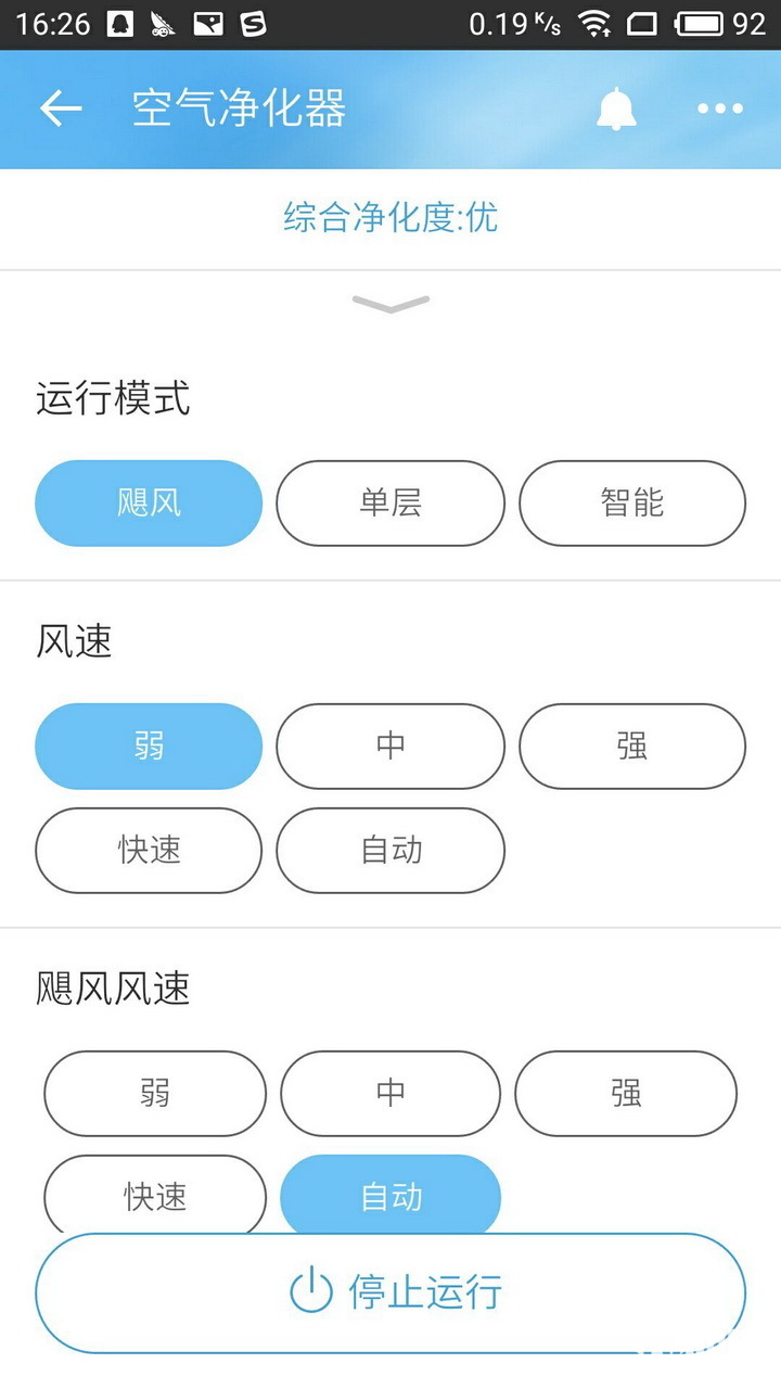 运行模式的调整在上拉菜单,模式切换、风速调整等操作全部集中在这里,横排的选项设计按键UI之间留有十足的空间,让按键界面显得规整不拥挤,使得整个界面感觉清爽干净,对应功能点一下可以实现调节,在操作上提供了相当大的便利。