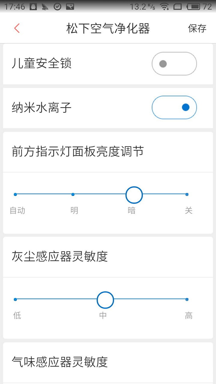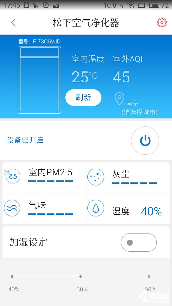 松下 F-73C6VJD-S采用了京东微联APP在功能设置相当齐全,全部功能都能在APP上完成操作,包括风量调节、睡眠模式、自动模式,还能同步显示室内PM2.5数值、TVOC室内空气品质以及初效和多效滤网的损耗情况。空气净化器的整个运行状态可以一目了然的观察到。京东微联的UI设计朴素,用起来也是属于一看便知的等级,智能手机用户都能够第一手时间上手。