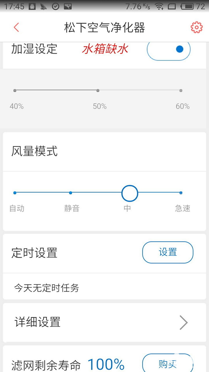 针对产品特性也有特别的优化,加湿功能中,水箱中水量不足的提示不光是机器上,在APP上也会进行提醒,和产品本身同步率也相当高,气味、灰尘、PM2.5都能和指示灯颜色完美搭配。两者契合度很高。